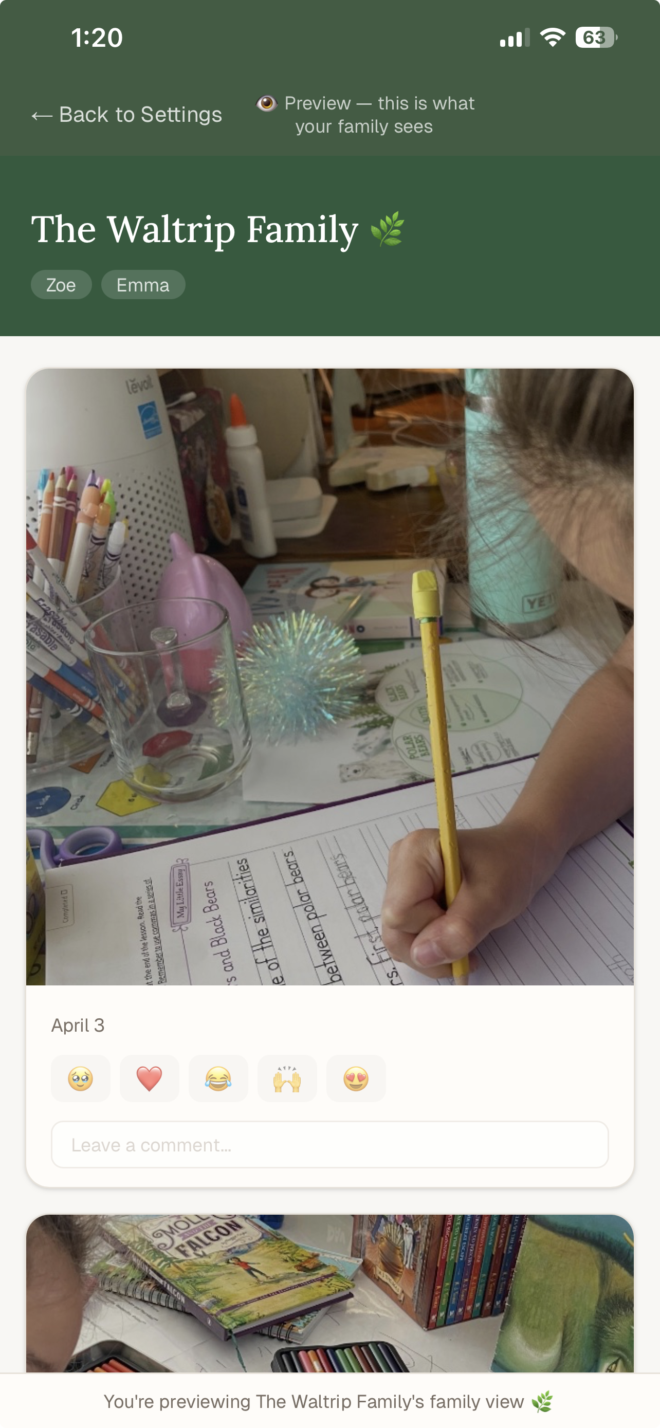 Photos, little quotes, field trips, books they loved β saved as it happens. Build a memory book your family will treasure forever.